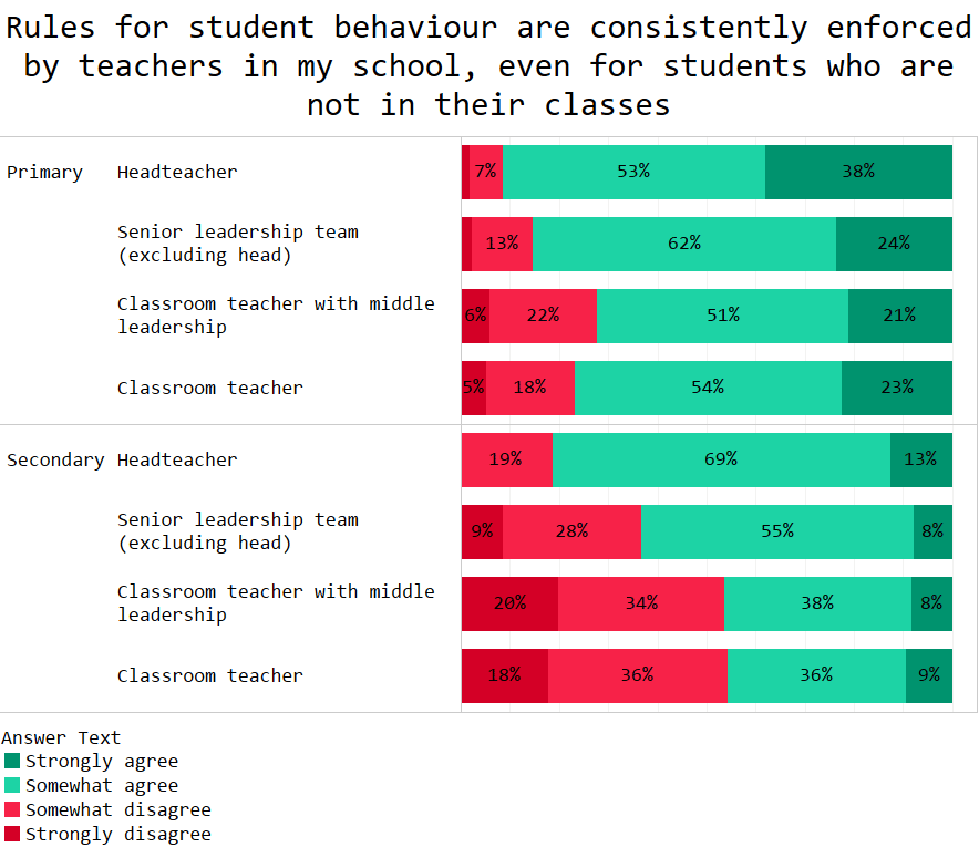 Heads in secondary schools seemed particularly at odds with the views of classroom teachers. Only 19% of heads ‘somewhat disagreed’ that staff consistently enforced behaviour rules, and around 2% strongly disagreed. Among classroom teachers, 36% ‘somewhat disagreed’ and a whopping 18% ‘strongly disagreed’. (This was even higher for classroom teachers with a middle leadership position). Classroom teachers were therefore 2.5 times more likely to think behaviour rules were inconsistently enforced compared to the views of headteachers.