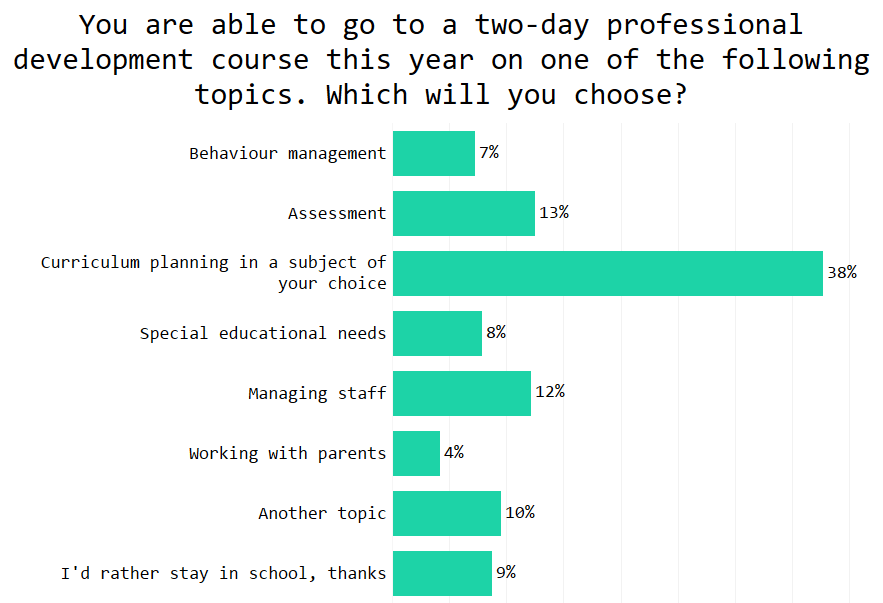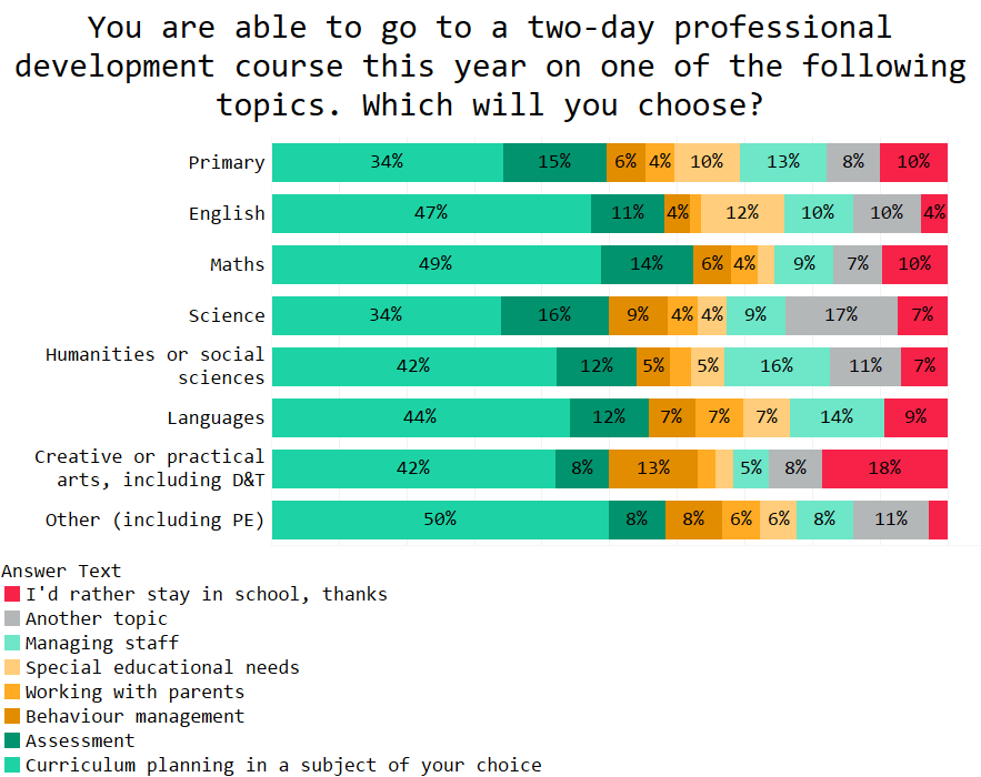 And we were right! Primary teachers, for example, were among the least likely to go for curriculum, but among the most likely to ask for support with managing staff.