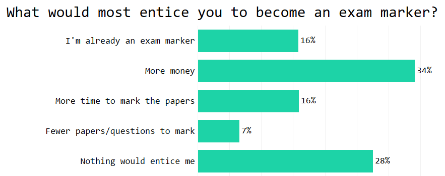 For the rest, they said more money and more time to mark the papers would make a big difference. Although 28% of Tappers also said that nothing would entice them to mark! Yikes!