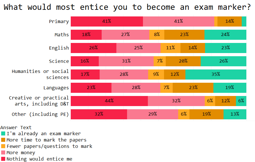 Views differed greatly by subject and phase. Primary teachers were the least likely to want to mark exams, but also the ones most motivated by hard cash!