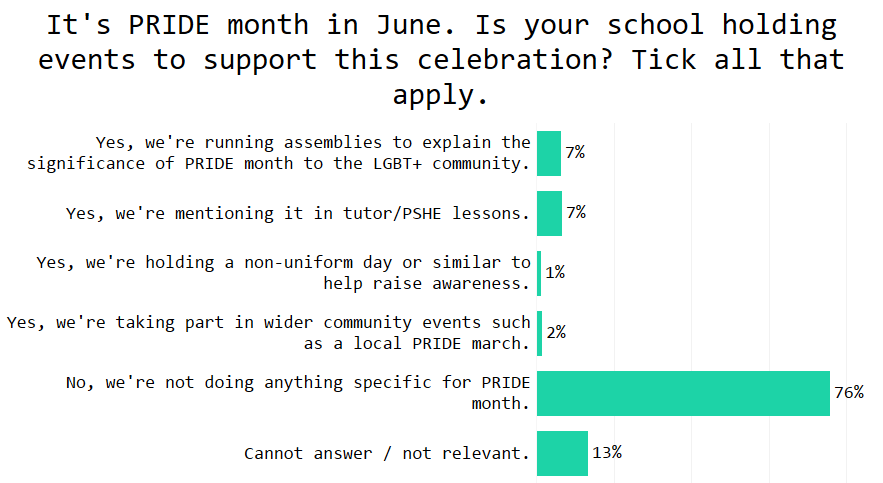 This confidence has not translated into Pride activities, however. With 75% of teachers saying their school was not doing anything to mark Pride month: not even a tutorial or assembly mention.