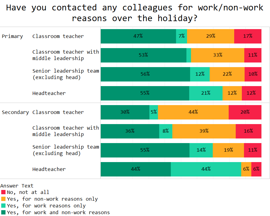 On the upside, most of you do seem to be having a thorough break from school. With only 15% of teachers answering school-related emails on a given day and that figure is heavily skewed by headteachers (among whom about 40% answered emails on a given day).