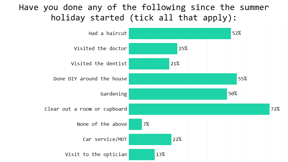 Do teachers spend their holidays sunning themselves and snoozing? Actually, there’s a lot of chores involved! Within the first two weeks of summer more than half of teachers had a haircut, a quarter visited the doctor, and a whopping 72% cleaned out a room or cupboard.