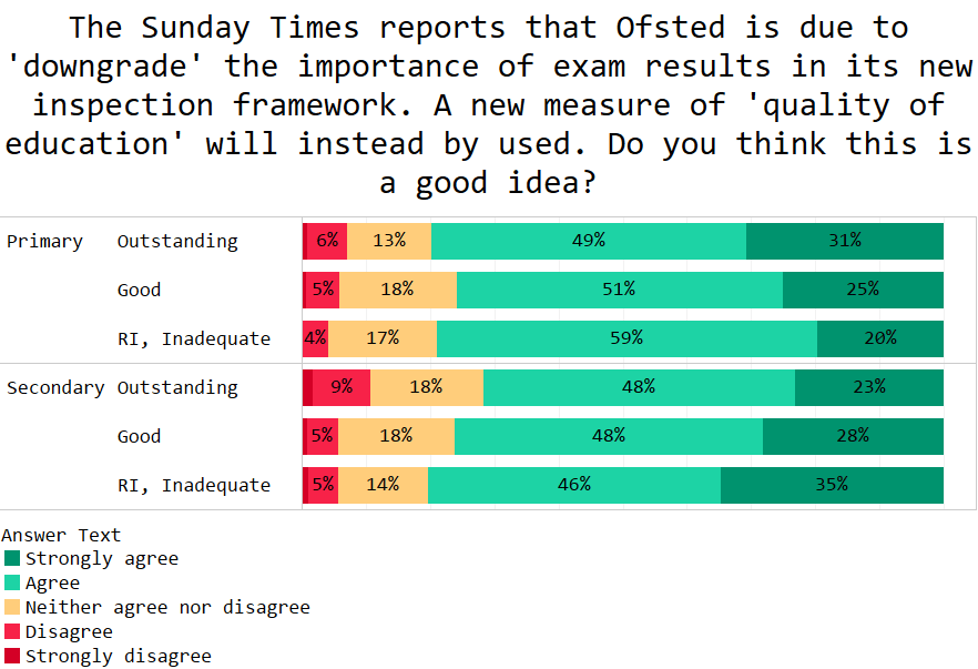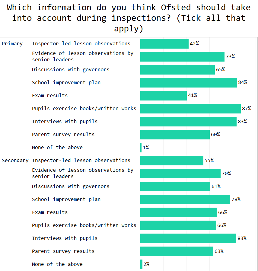 Pupil voice also gets a vote of confidence with 83% of teachers thinking inspectors should speak to them. Question is: what are the 17% worried about?!