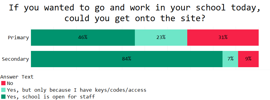 Spare a thought for the non-teaching staff, however, who are keeping schools open over the summer. On any given day, 70% of you said the school is still opened for staff – presumably by a site manager or finance, admin and business team. This is less true in primary schools, though many more primary teachers have access via a key or code than in a secondary school.