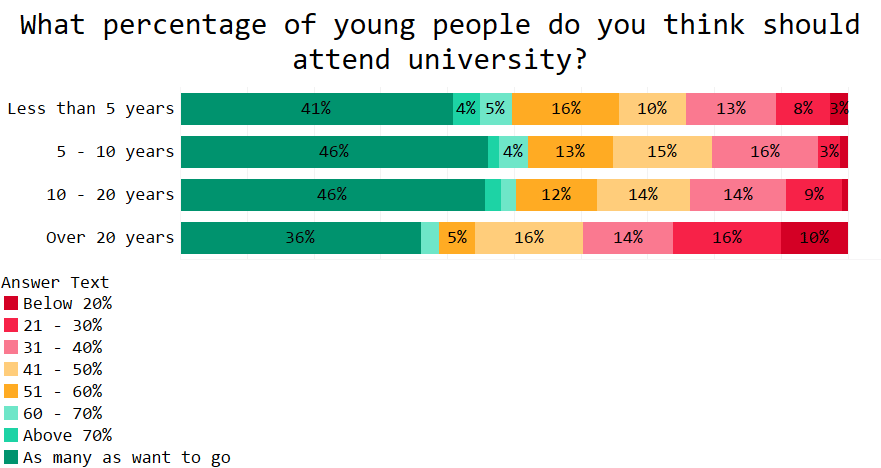 However, we found a difference between newer and older teachers and those in the ‘middle career’ chunk. Both newer and more experienced teachers were less likely to think a high proportion of young people should go to university.