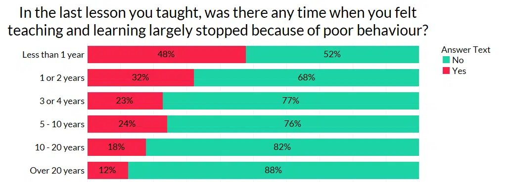Last week behaviour seems to have been worse than at any prior point across the term. Inexperienced teachers had the highest bounce, although teachers across all groups shifted upwards. What’s interesting is that when things take a turn for the worse, they tend to affect new teachers more than the other groups. So they went from 40% of lessons disrupted last week, to 48%; whereas more experienced teachers only increased by a couple of per cent.