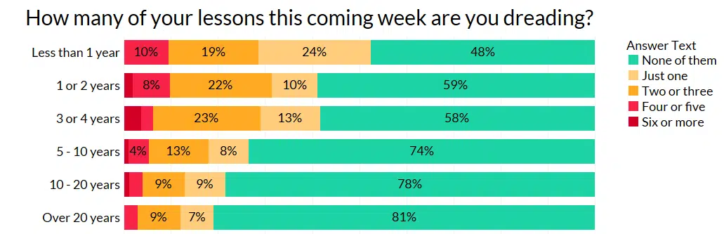 But newer teachers are dreading some lessons. Given that we lose most teachers in the first five years of the job, the substantial difference on this metric between those are in the profession for 4 or fewer years is worth paying attention to.