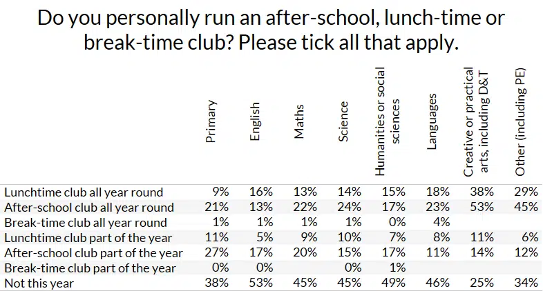 We found: English teachers are the least likely to run a club, and creative arts teachers are most likely. In fact, a whopping 75% of creative arts teachers do clubs. If secondary schools keep cutting the number of arts teachers, it’s therefore likely extra-curricular clubs will take a hit.
