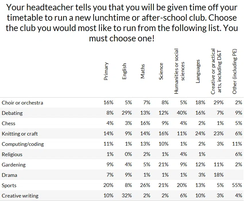 English teachers are more likely to choose creative writing than any other group – but given they are less likely to do a club, this is likely an area where schools are under-capacity.