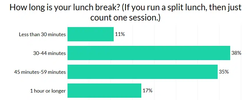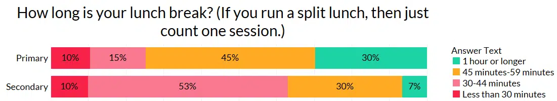 The majority (63%) of secondary schools have a lunch break shorter than 45 minutes. While a bigger majority of primary schools (75%) have at least 45 minutes.