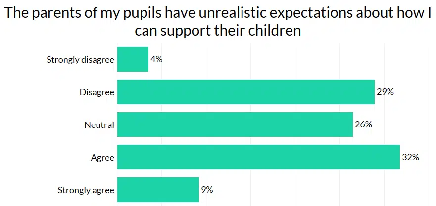 In total, 41% of teachers think parents have unrealistic expectations, whereas 33% think the expectations are reasonable. (The rest are in the middle).