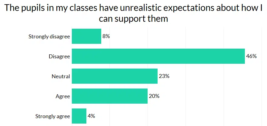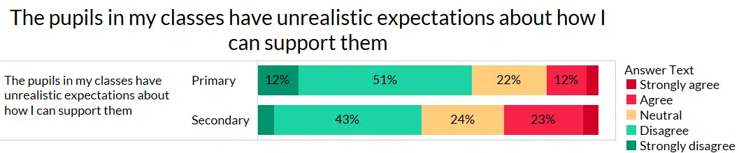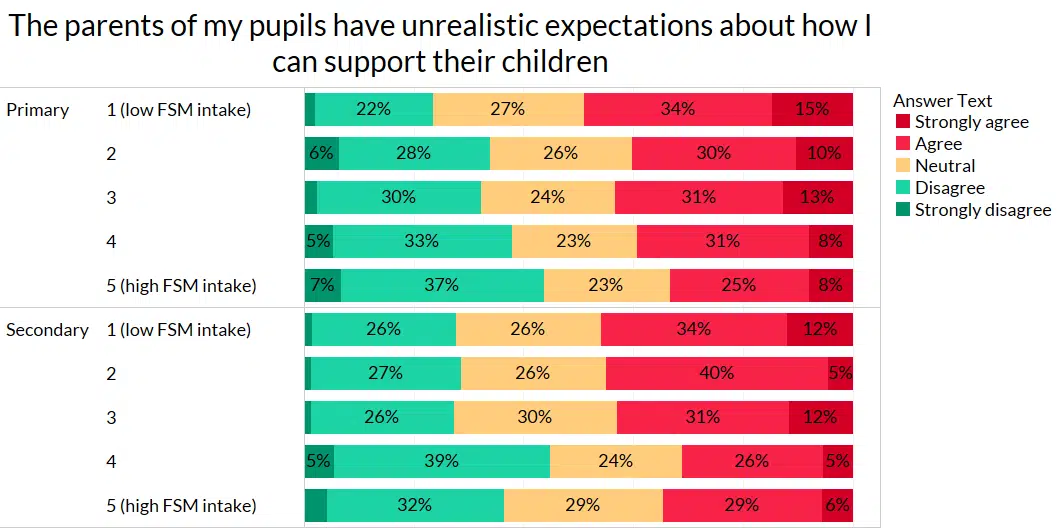 In the wealthiest area (1), teachers are more likely to say that parents have unrealistic expectations – both for primary and secondary schools. But there’s a fairly divided view across all schools.
