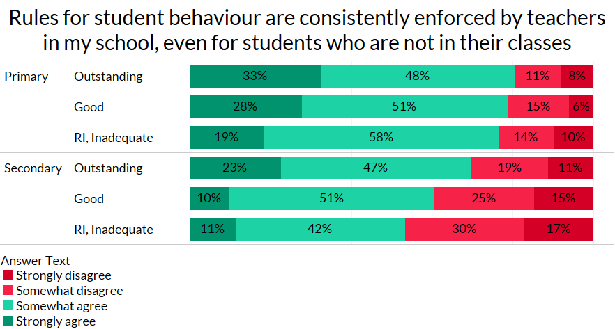 Also, as above, we found that senior leaders tend to over-estimate the extent to which rules are consistently enforced compared to the feelings of their teachers.
