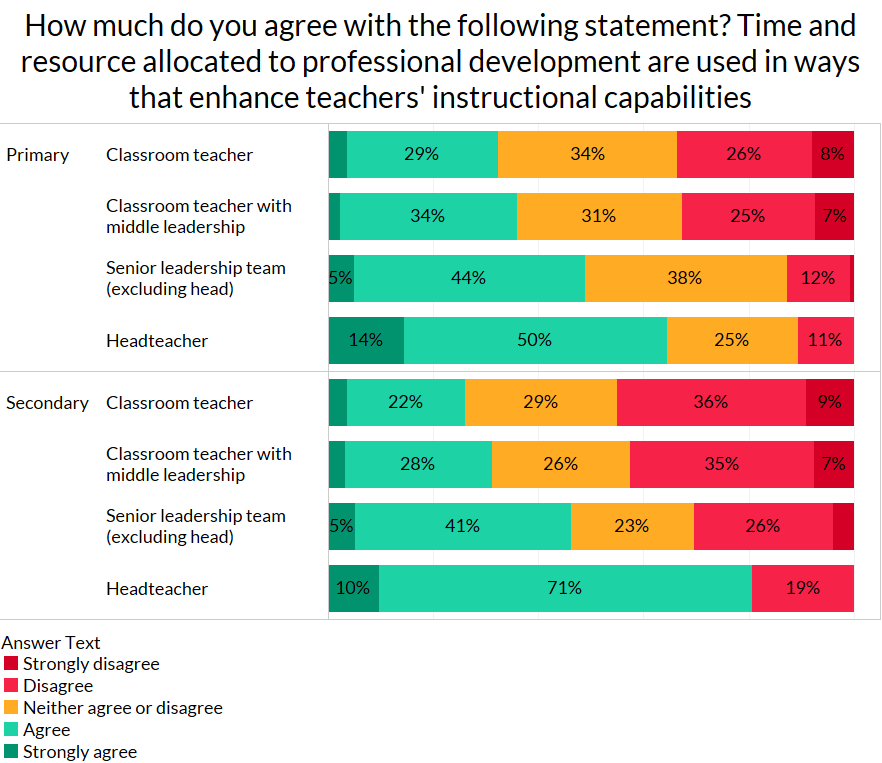 In both primary and secondary schools, senior leaders are much more likely than classroom teachers to believe that time and resources are helping teachers get better at their classroom delivery. Or, to put it another way, the people who are likely organising and choosing the professional development think it is more effective than those who are on the receiving end of it. ?