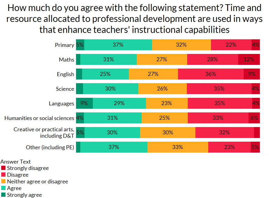 Across subjects, primary teachers were the most positive about professional development and English teachers were the most negative.