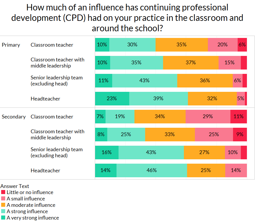 Possibly not. Although teachers don’t always think resources are well-allocated, most (74%) do believe that CPD had at least a moderate influence on their classroom practice.
