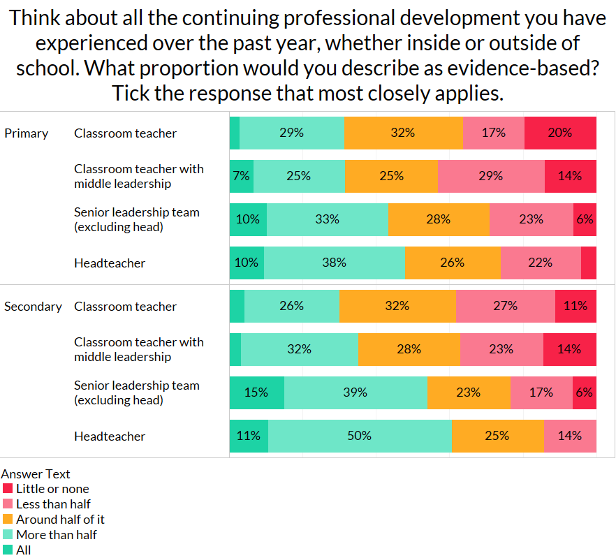 School and senior leaders also say they have attended a higher proportion of evidence-based interventions over the past academic year. At secondary level, twice as many heads as classroom teachers said more than half of their development was done in an evidence-based way.