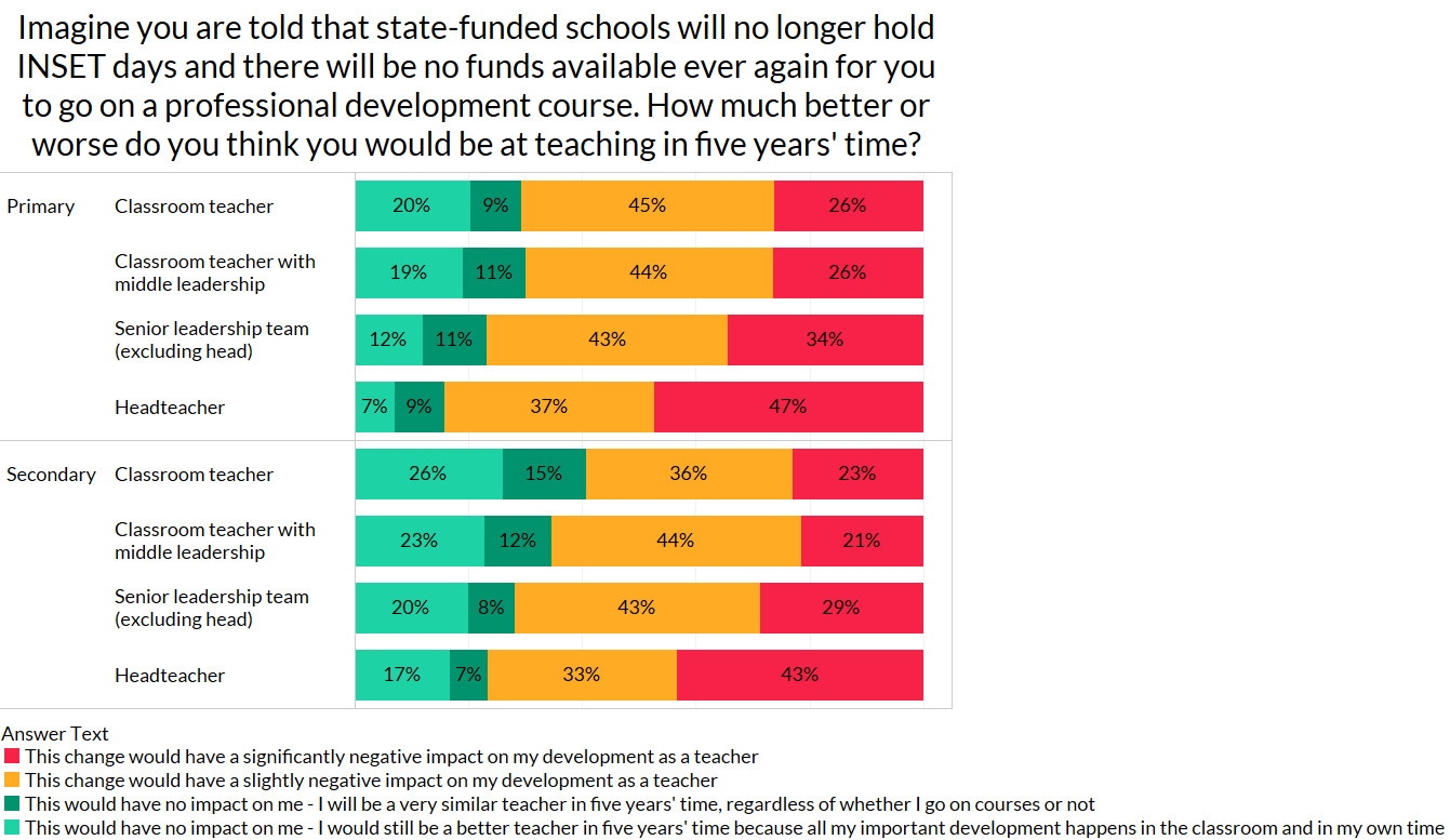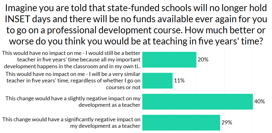 A whopping 20% of teachers (1 in 5) said that no INSET or training days would not impact them at all because their development comes from classroom practice and things they do on their own time.