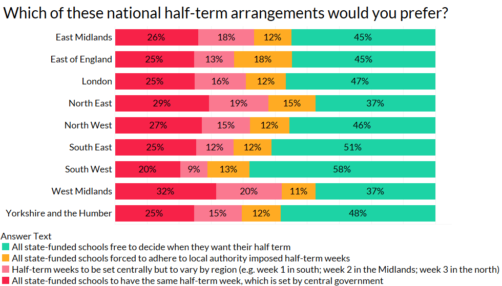The west midlands came out more in favour of a nationally imposed solution whereas the south west much preferred schools to have their freedoms. (Any thoughts as to why? We have hunches, but they’re a bit loose…)