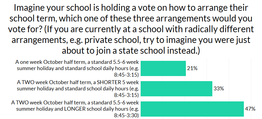 The 2-week October holiday, with a 15-minute daily trade up, was by far the most popular. Several users commented that this is because their school day was already that long, so it didn’t seem much of a sacrifice.