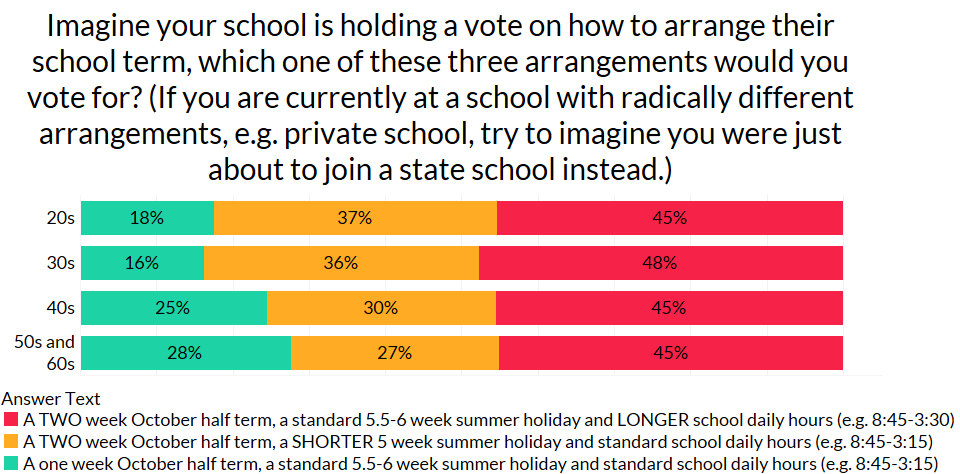 The trend for longer days was fairly equal across all age groups. However, over 40s showed a much greater preference for the standard pattern (one-week half-term, as shown in green below) than the under 40s group.