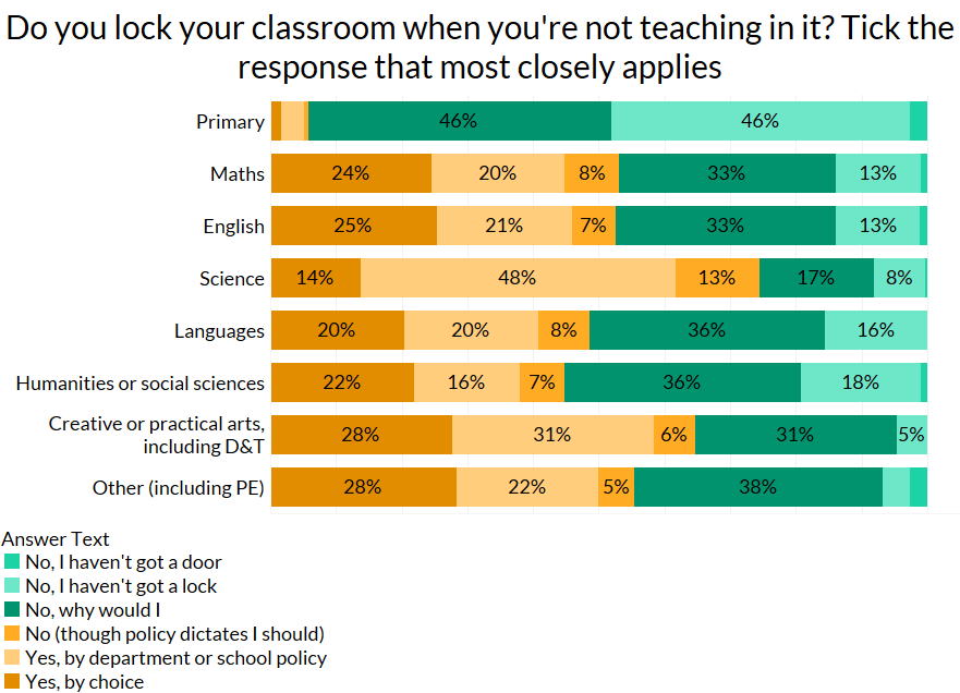 An unsurprising quirk: Primary teachers mostly DO NOT lock their classroom. (Around half don’t even half a lock).