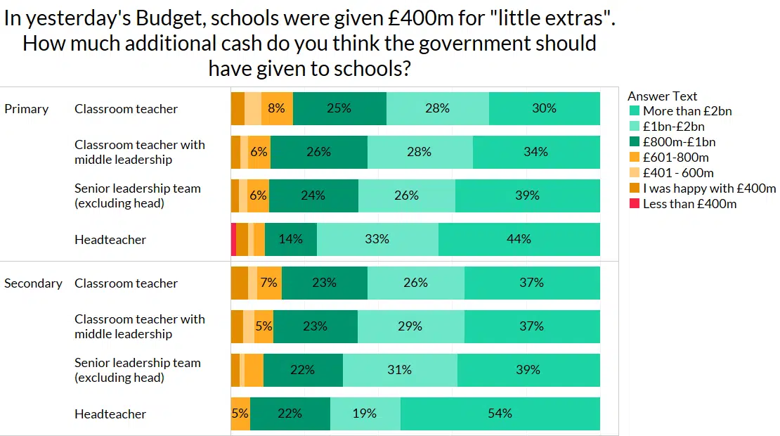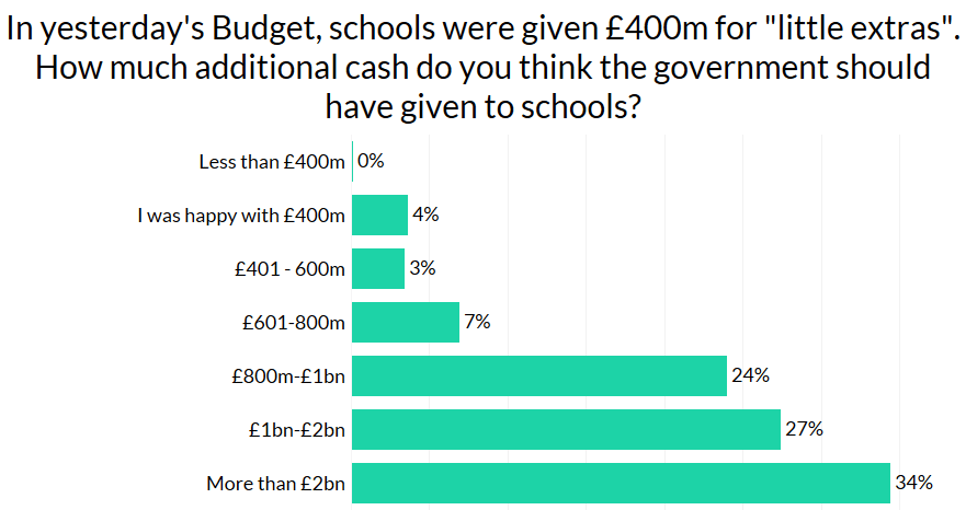 Alas, the Chancellor needed much deeper pockets. Over a third of teachers said schools need at least £2bn more.