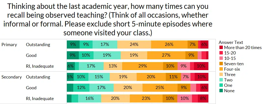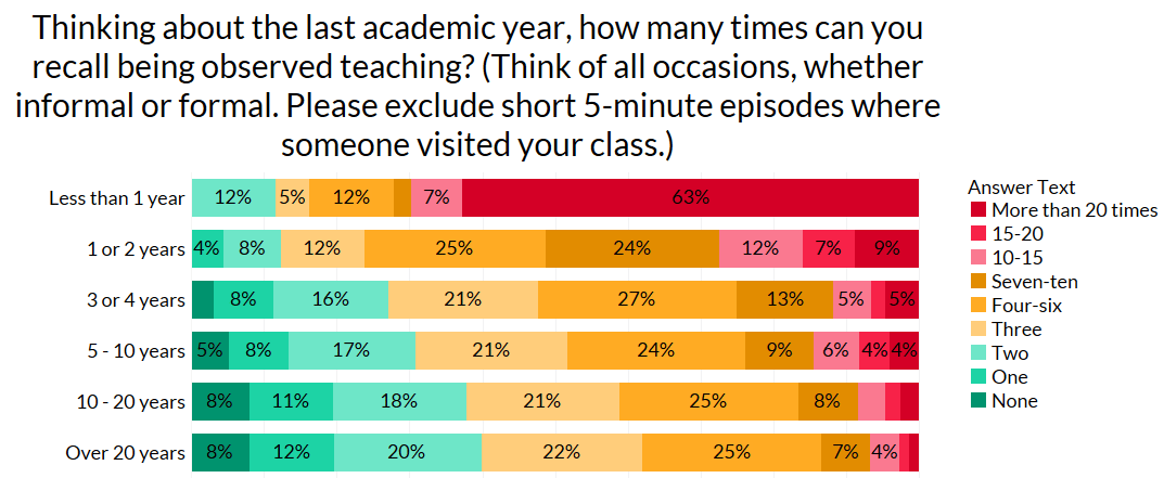 In their first year, teachers get observed A LOT. Newbie tappsters told us that in the last academic year they were oserved more than 20 times. Yet, by Year 2, this drops dramatically, with around half of year 1/2 teachers observed fewer than 10 times. By year 5, hardly any one even has six observations – and this includes informal drop-ins, too.