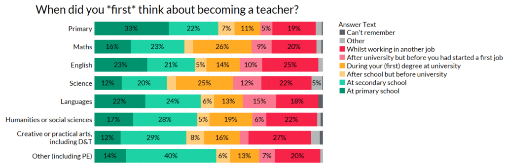 Teachers first think about becoming a teacher when at primary school, secondary school, or in another job. Note: university is not so common for having the bright idea of teaching.