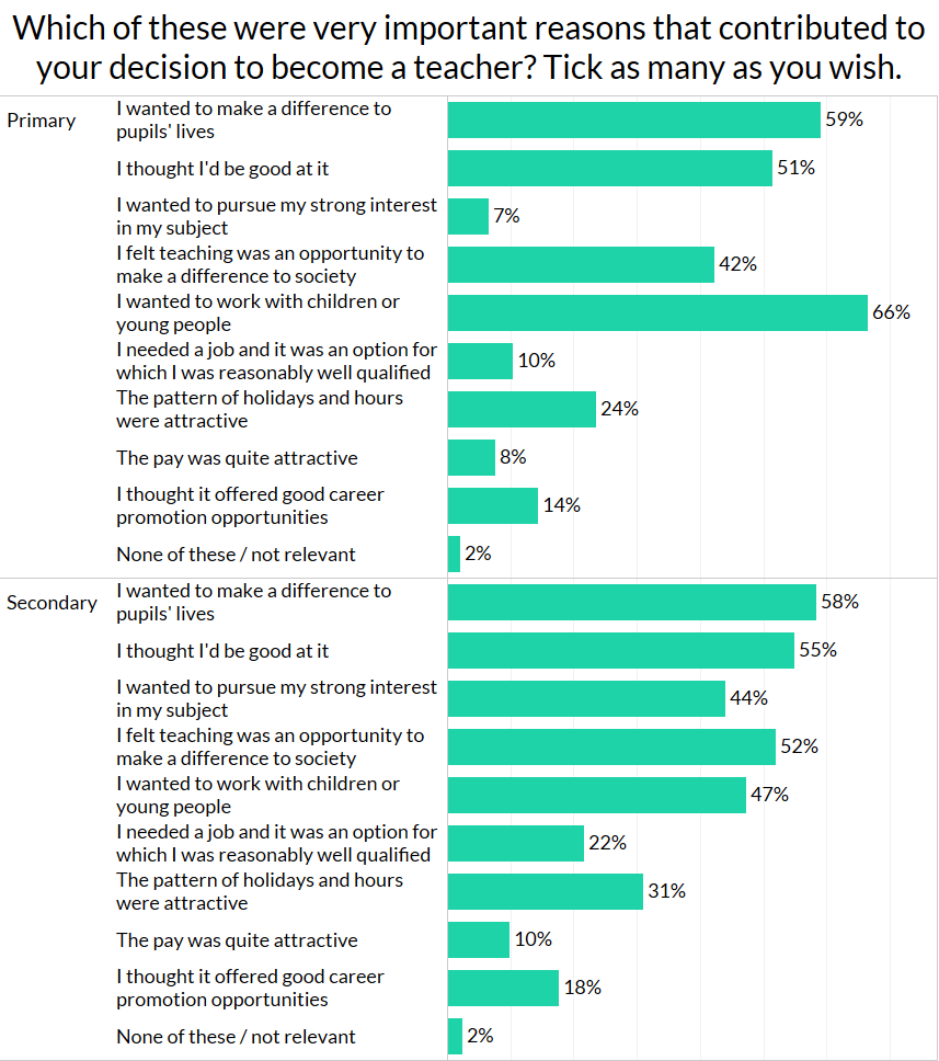 Secondary teachers are much more influenced at university than primary teachers. One reason might be that secondary teachers are particularly motivated by getting to use their subject. Only 7% of primary teachers do the job because of a subject link; whereas subject matters for 44% of secondary teachers.