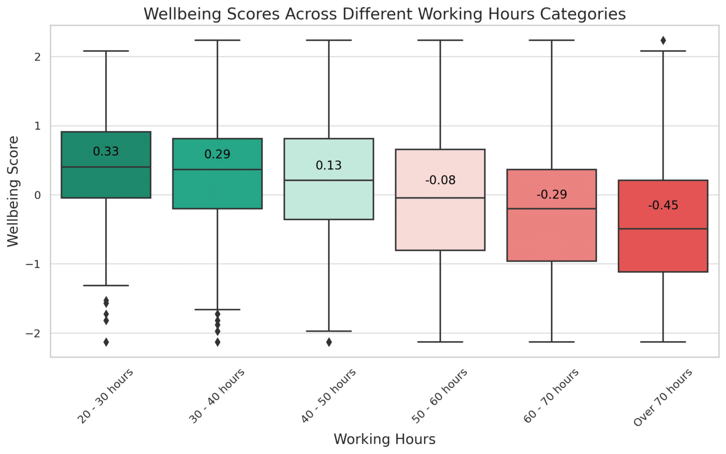 We can clearly see that teachers working the longest hours are reporting the lowest wellbeing in our survey. The wellbeing score we have created is based on your responses to questions about burnout, stress and contentment. We then compared these scores to the number of hours you said you were working in a week just before half term. It’s clear that those working very long hours, also report lower wellbeing on average. (But there is a lot of variation – there are happy teachers working long hours!)