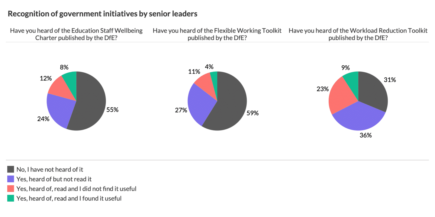 - On the Education Staff Wellbeing Charter, over half have never heard of it, only 1-in-5 have read it, and just 8% thought it was useful.