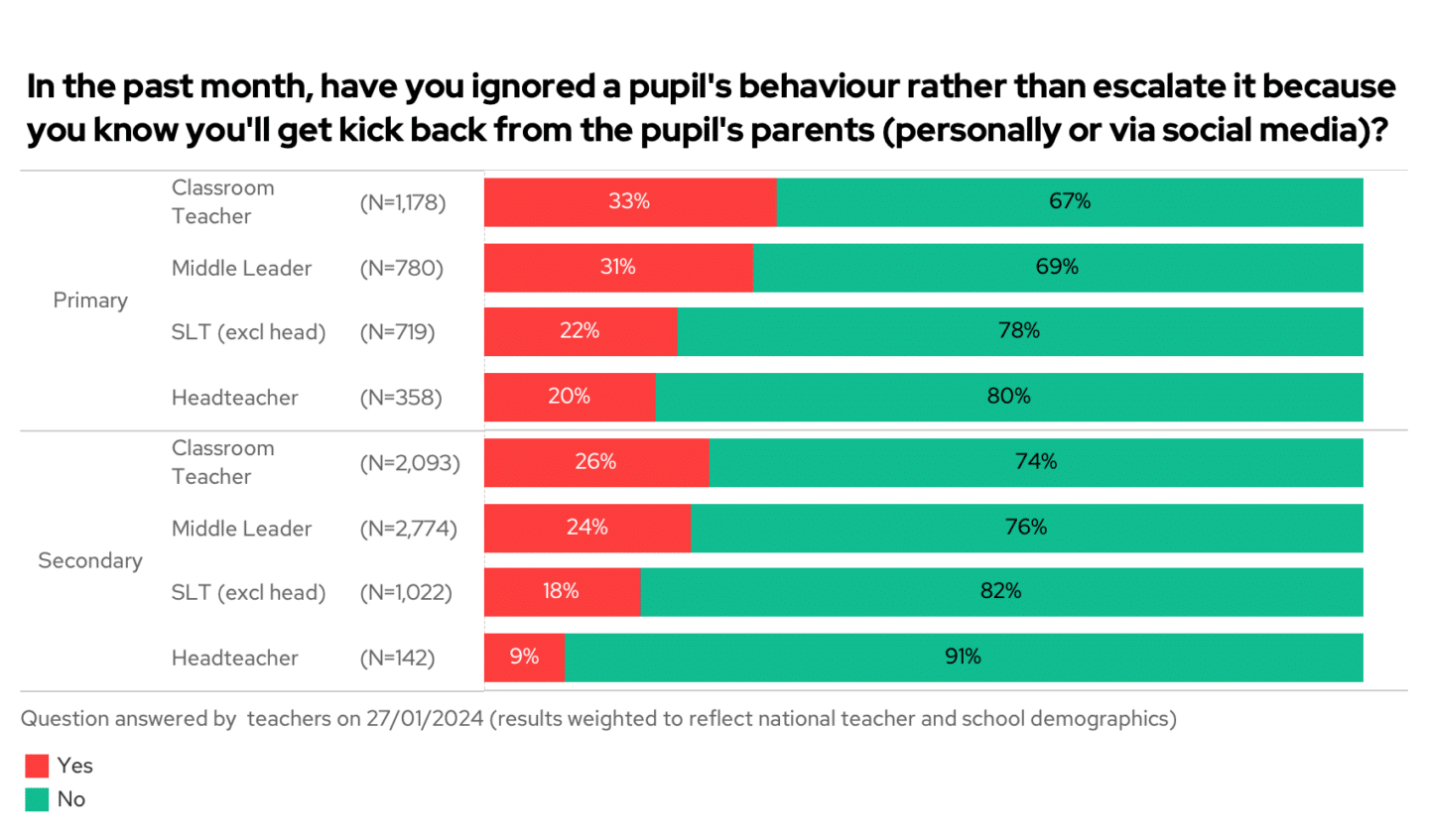 Over a quarter of you have said that in the past month you chosen to ignore a pupil’s behaviour rather than escalate it, because you know you’ll get kick back from the pupil’s parents. This is a huge figure and we wanted to explore more about who this affects the most.