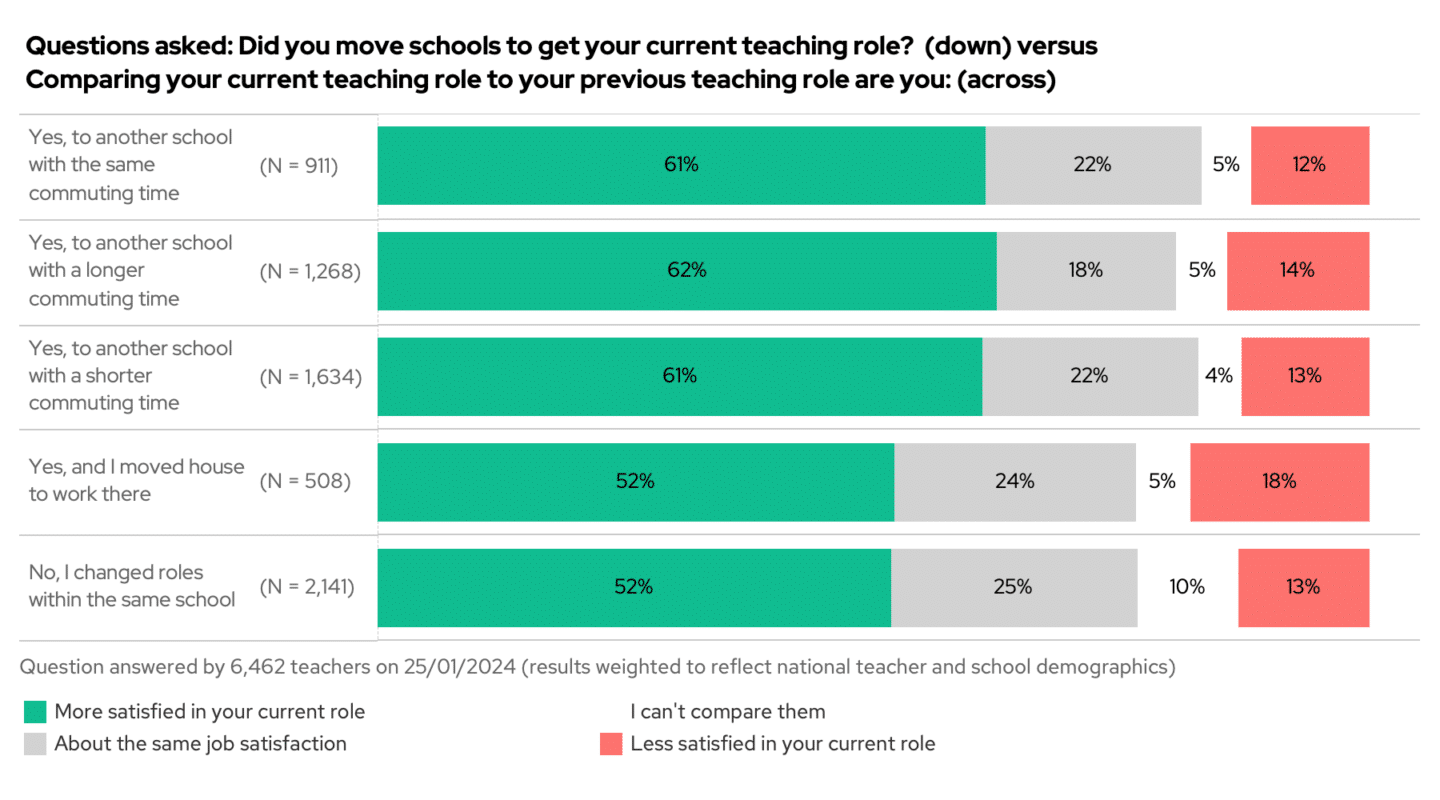 The most successful moves are for those moving to a new post in a new school within an area they already live. These teachers often have an advantage of knowing whether it is a good school to work at through local word of mouth. (Note: there’s a slightly higher chance you won’t be happy if the commute is longer for the new job, but it’s a small chance).