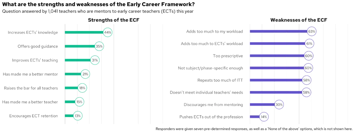 From the mentors’ point of view, 41% say it has increased ECTs knowledge, BUT, 50% said it repeats too much of ITT, is not subject/phase-specific enough, is too prescriptive and does not meet individual teachers’ needs.