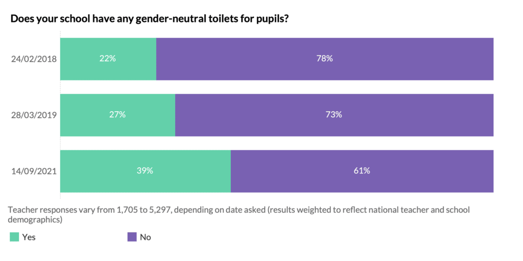 Many of you thought we’d gone potty when we first asked about gender-neutral toilets in 2018. Back then, few people were talking about gender-neutral toilets, yet 22% of teachers said their school had them. The inclusivity drive of the past few years has seen this percentage increase nearly two-fold to 39%.