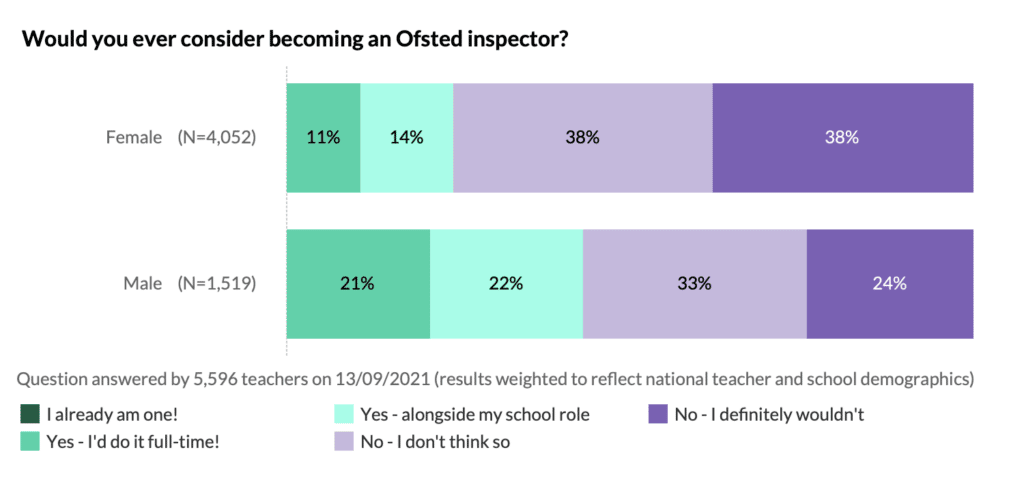 Male teachers were more likely to consider becoming an inspector than female teachers. 43% of male teachers would consider it, compared to just 25% of female teachers.