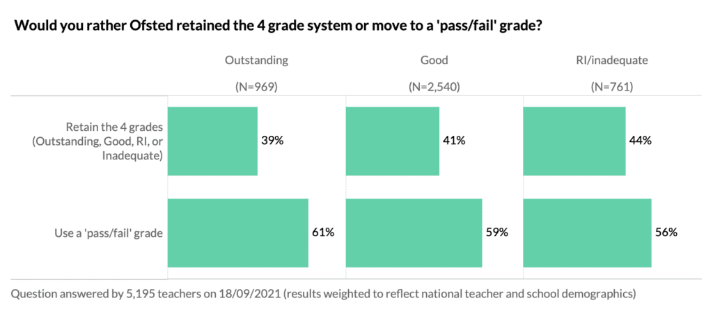 We also learned that a majority of teachers support Ofsted moving towards a pass/fail system for grading. Over the past few years, this percentage has fluctuated between 50% and 60%. Interestingly, Outstanding schools were marginally more in favour of changing to the pass/fail grade than those classed as RI/inadequate.